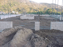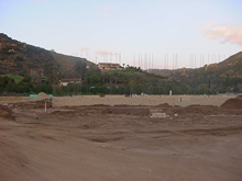 February 18, 2003 - The heavy rains didn't dampen our spirits. More great progress has been made: sewer lines installed, walls erected and about ready for the new steel roof, and the Petco Courtyard is coming along nicely! | |